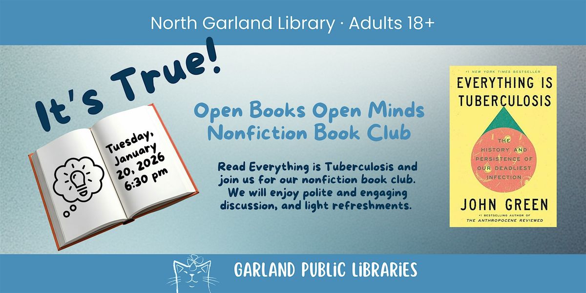 Read Everything is Tuberculosis by John Green and join us for Open Book Open Minds, our nonfiction book club. We will meet at the North Garland Library for polite and engaging dicussions. Light refreshments will be provided. No registration required.