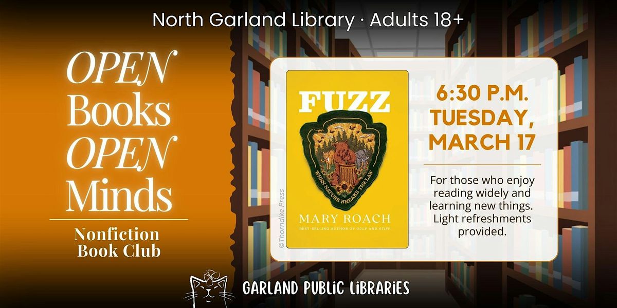 Read Fuzz: When Nature Breaks the Law by Mary Roach and join us for Open Books Open Minds, our nonfiction book club. We will meet at the North Garland Library for polite and engaging dicussions. Light refreshments will be provided. No registration required.