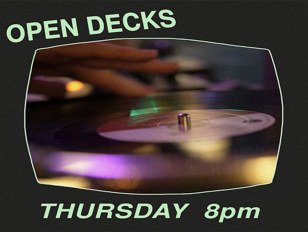 Info: Join us for Open Decks — like karaoke, but with vinyl! Everyone gets a 30-minute slot; first come, first served. Any style is welcome, but keep it groovy and listenable for people sitting and sipping drinks on a Thursday night (yes, even techno — make it a vibe).