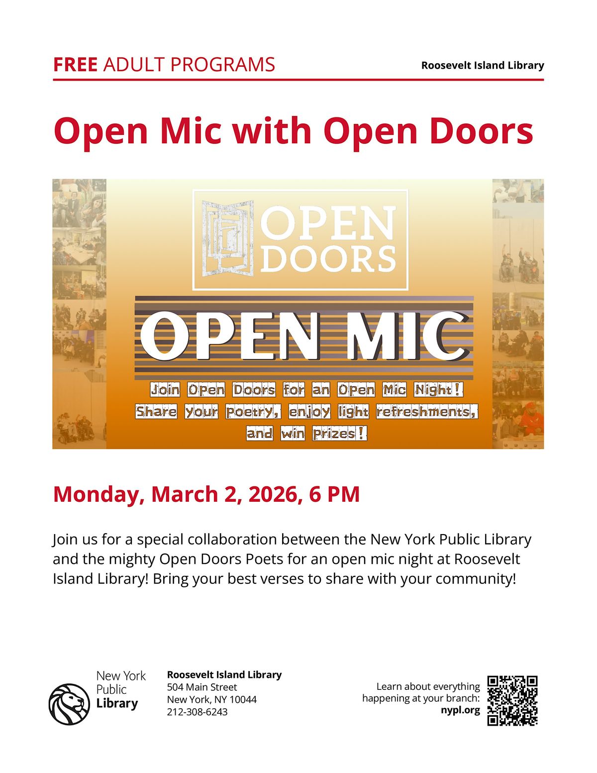 Join the OPEN DOORS Reality Poets for our first open mic of 2026 at the Roosevelt Island Public Library. It’s a new year, and we want to see what y’all got! Join us for a chance to win prizes and meet other artists in our poetry-sharing community.