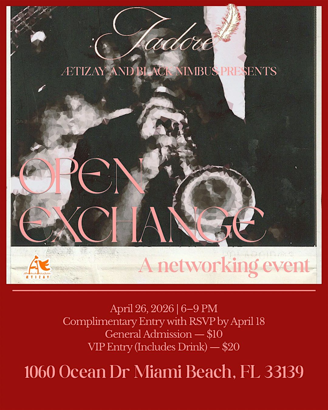 Open Exchange is an intimate, high energy networking experience curated by Ætizay, bringing together emerging artists from across the Black diaspora and beyond. Rooted in Haitian culture, the event creates a space where creatives of all mediums can meet, connect, and build genuine relationships in person.