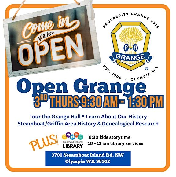 Our Grange Hall is open! Tour the hall, ask questions, get access with an officer to local history and information from our archives. Plus, TRL Anywhere Library will be onsite from 9:30 - 11:00 with kid's storytime from 9:30 - 10:00.