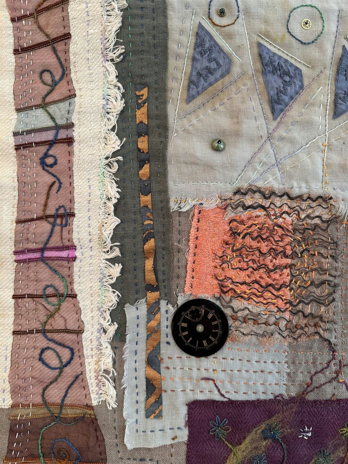 The show features work by several Brooklyn artists, including both experienced quilters and those new to the craft. Artists were asked to respond to the prompt: “What makes you pause lean in and look a little more closely?” They were encouraged to forgo functionality and instead explore materials, form, and technique. The only constraint, that quilts must be 20” x 20” or smaller, offered a structure for experimentation and slowness.