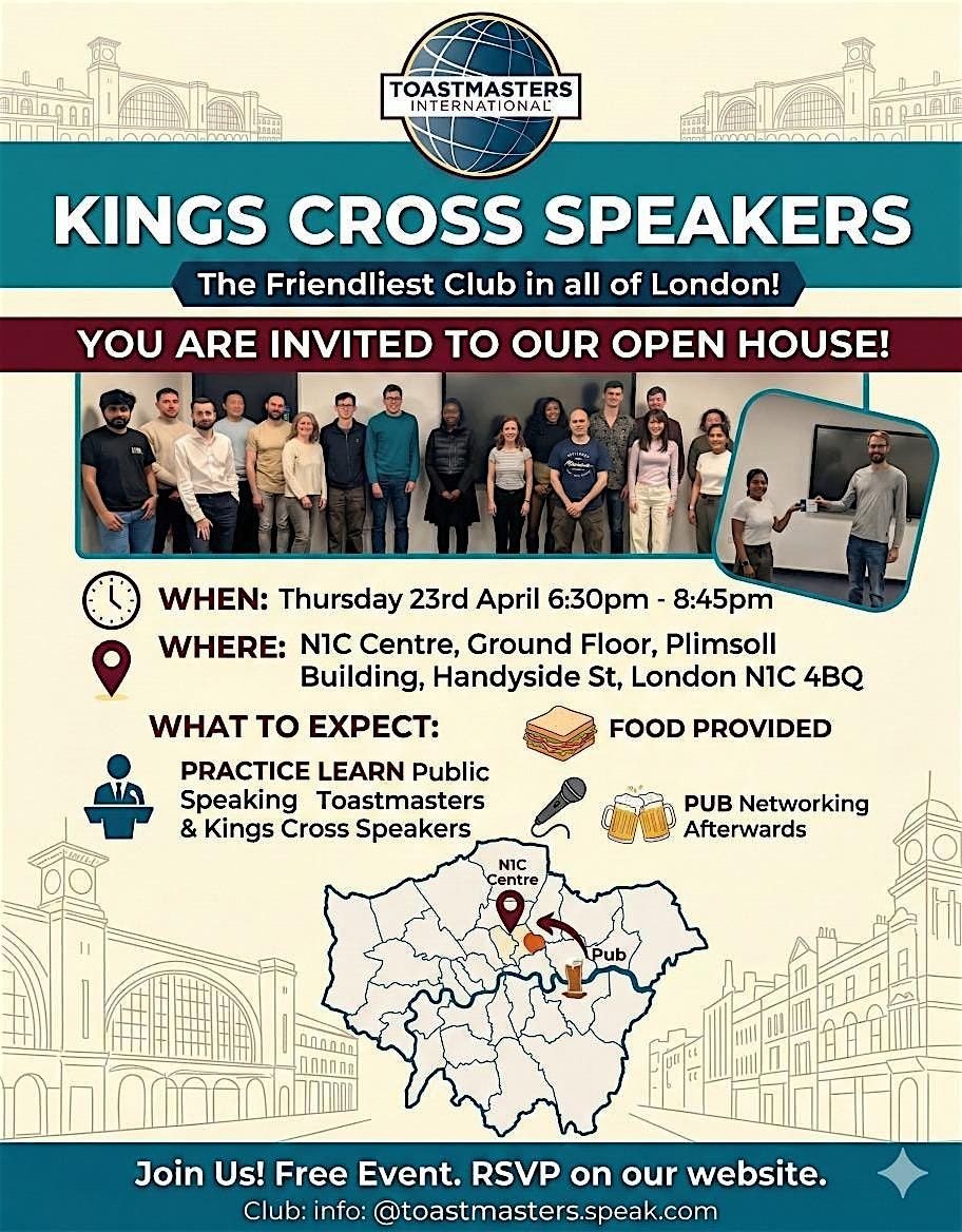 Public speaking isn’t a "natural talent"—it’s a muscle. At King’s Cross Speakers, we help you build that muscle in a supportive, friendly environment where mistakes are just part of the progress.