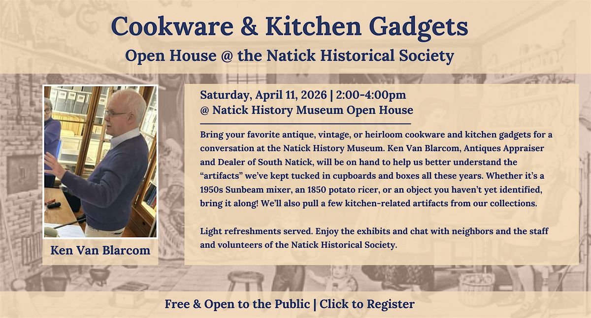 Bring your favorite antique, vintage, or heirloom cookware and kitchen gadgets for a conversation at the Natick History Museum. Ken Van Blarcom, Antiques Appraiser and Dealer of South Natick, will be on hand to help us better understand the “artifacts” we’ve kept tucked in cupboards and boxes all these years. Whether it’s a 1950s Sunbeam mixer, an 1850 potato ricer, or an object you haven’t yet identified, bring it along! We’ll also pull a few kitchen-related artifacts from our collections.