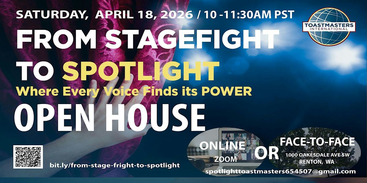 Whether you've never spoken in front of more than two people or you're already comfortable on stage and ready to shine brighter, this Open House is your moment to step into the light.