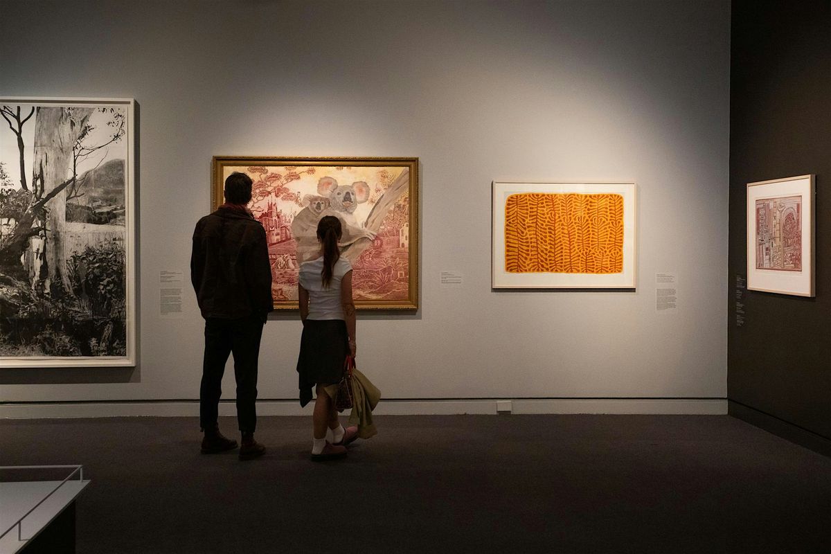 Unfolding: First Nations Works on Paper is a major exhibition celebrating the diversity and dynamism of works on paper by First Nations artists in the MPRG collection. The exhibition reveals how First Nations artists have used paper as a material to demonstrate a particular kind of strength and permanence – one that holds, carries and expresses identity, body and self, language, connection to Country, history and community.