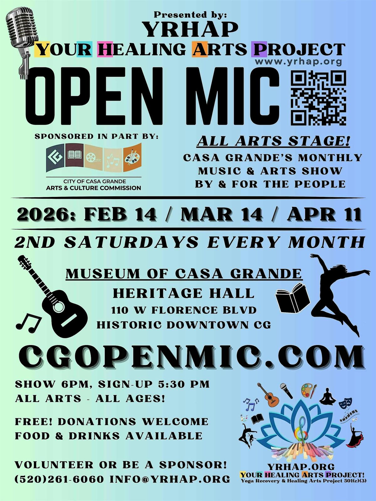 ABOUT THE OPEN MIC ALL ARTS STAGE: Come enjoy Casa Grande's MONTHLY talent showcase by & for the people! Share your talents on the all-arts community stage, get creative and inspired, and encourage and support other artists in the community. All creative mediums welcome including: musicians, vocalists, poetry, dance, visual art, performance art, rap, comedy, storytelling, juggling, skill demonstrations, skits & sketches, and more! See you on the stage or in the audience! Please keep it clean, all ages show. Thank you for supporting your own creativity, your local community, and the power of the arts.