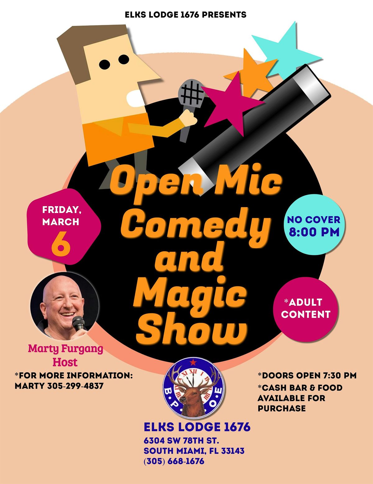 Comics & Magicians- this is a great place to work on that new material or tweak some old material. Plenty of seating with a cash bar & food available for purchase. Bring friends & enjoy the show, always a good time! No cover charge! Plenty of parking @ the back of building!