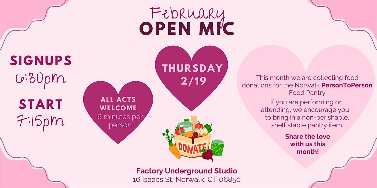This month we are collecting food donations for the Norwalk PersonToPerson Food Pantry! If you are performing or attending, we highly encourage you to bring in a non-perishable, shelf stable pantry item (or a few!) Not sure what to bring? Here are items they’re in most need of: