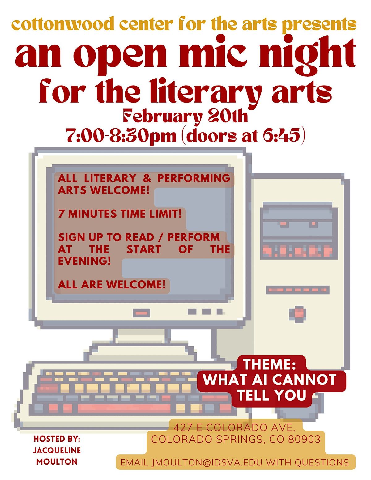 This open mic welcomes any writer of any level and also welcomes any of the performative arts! We would love it if you came and read / performed your work with us -- each month of the open mic is on a certain theme, a theme we vote on each month. Each participant is allowed up to seven minutes, but you do not have to take up the full seven minutes of course. All are welcome to attend as well, you do not need to read in order to come, we love our crowd participants just as much :) We do our open mic each month, typically on the third Friday of the month.
