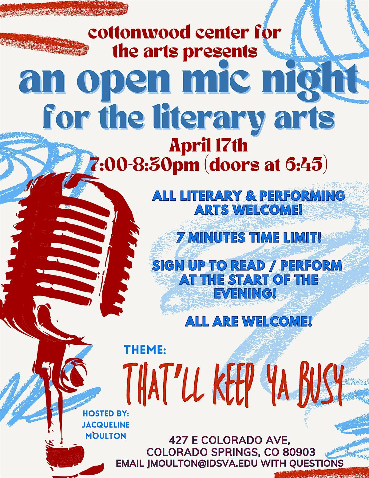 This open mic welcomes any writer of any level and also welcomes any of the performative arts! We would love it if you came and read / performed your work with us -- each month of the open mic is on a certain theme, a theme we vote on each month. Each participant is allowed up to seven minutes, but you do not have to take up the full seven minutes of course. All are welcome to attend as well, you do not need to read in order to come, we love our crowd participants just as much :) We do our open mic each month, typically on the third Friday of the month.