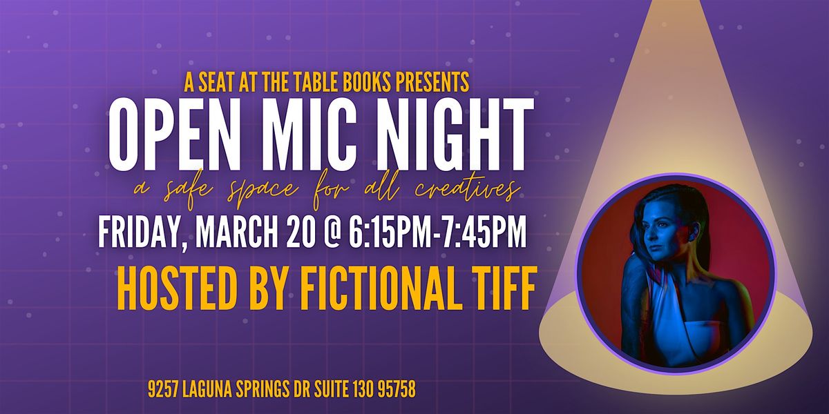 Let's dim the lights and turn up the volume for Open Mic Night! Join us as a performer or attendee and cheer on your fellow artists. Play an instrument, sing a song, perform a dance, share your poetry or spoken word, or do a standup routine. You don't need to be an expert - A Seat at the Table Books is a community safe space and supportive environment for all. All experience levels welcome.