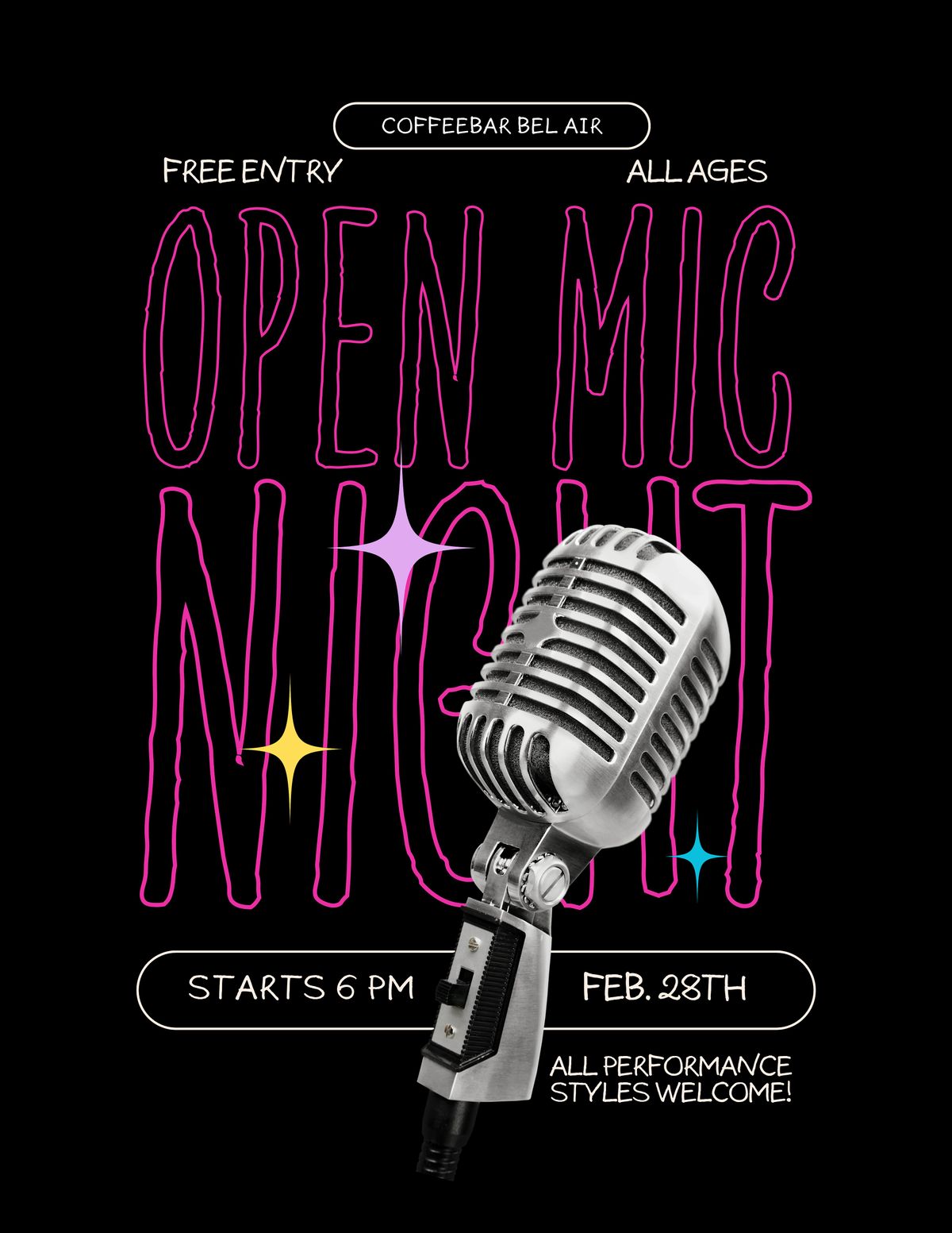 Come showcase your singing, poetry, comedy, or any other all ages talents or join the audience to watch! Sign up when you arrive!