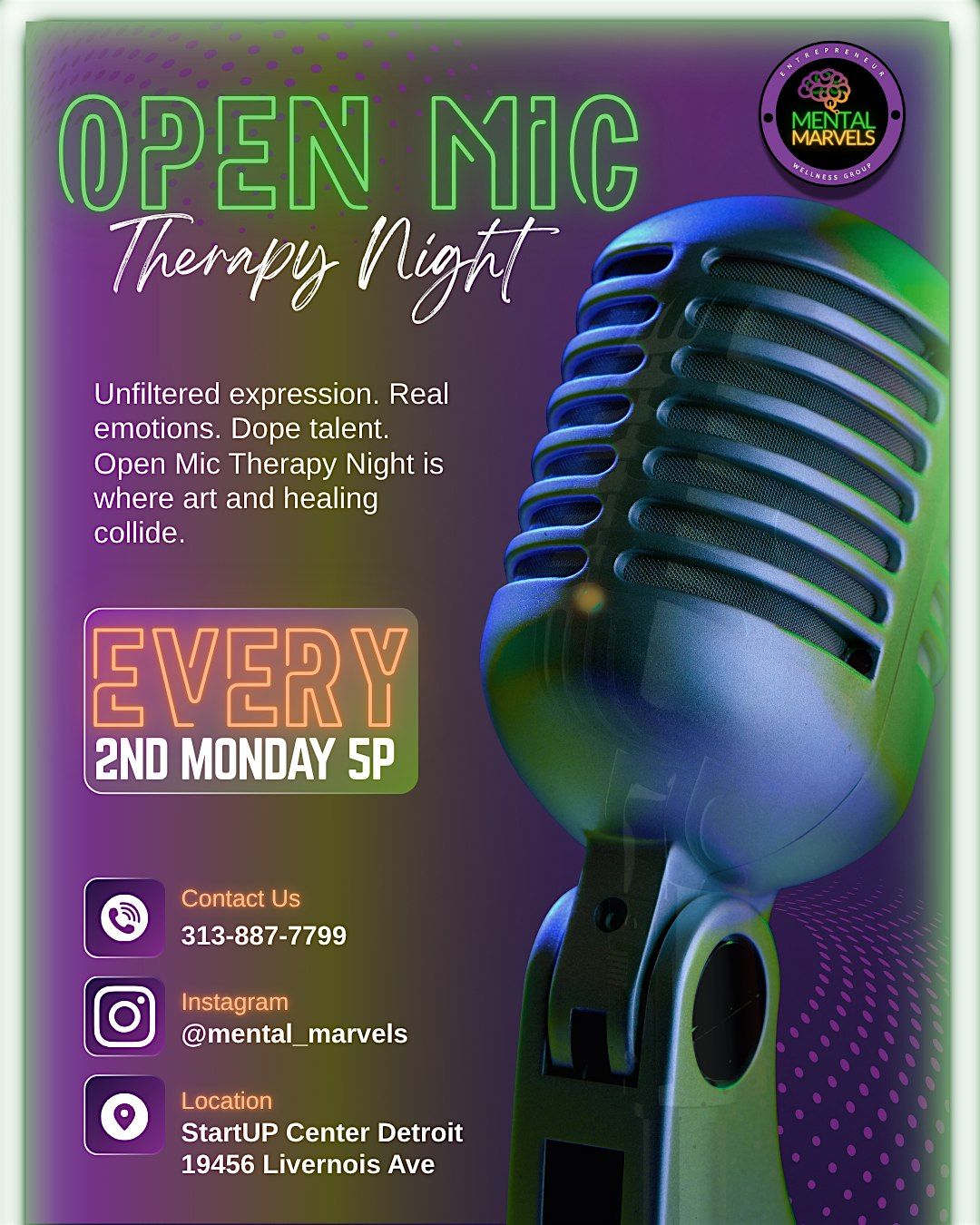 At StartUP Center Detroit, we believe healing is part of the entrepreneurial journey. Creativity is therapy. Community is therapy. Being seen and heard is therapy. Open Mic Therapy Night blends all three to help you reconnect with yourself while connecting with others.