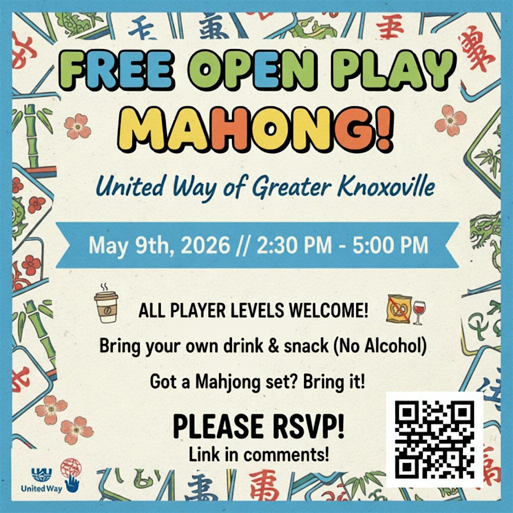 Come join our free social open play. If you have a set, please bring it. Bring your 2026 NMJL card. Whether you've been playing for years or just started, all are welcome. This is not an United Way event. They are letting us use their space. Vending machines are available. You are welcome to bring your own drinks and snacks. No alcohol please.
