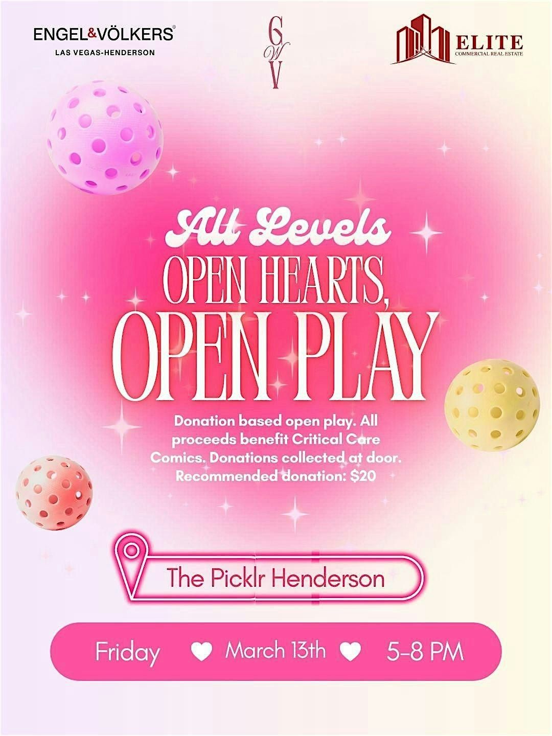 Come play, connect, and give back at our Open Play Open Hearts pickleball night benefiting Critical Care Comics. Open play is first come first serve, so players should RSVP on Picklr and hop into the rotation when a court opens. Donations are required at the door to play, and players should bring their own paddles and balls as gear will not be provided.