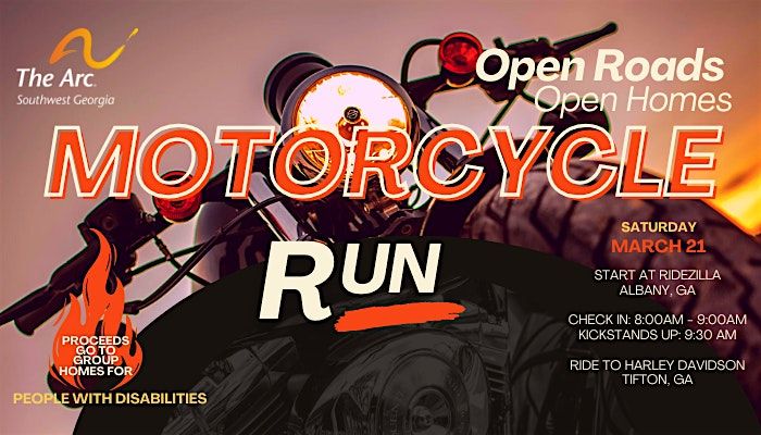 This scenic motorcycle run will take riders from Ridezilla in Albany, GA to Harley-Davidson in Tifton, GA, bringing together riders who want to enjoy the open road while supporting an important cause.