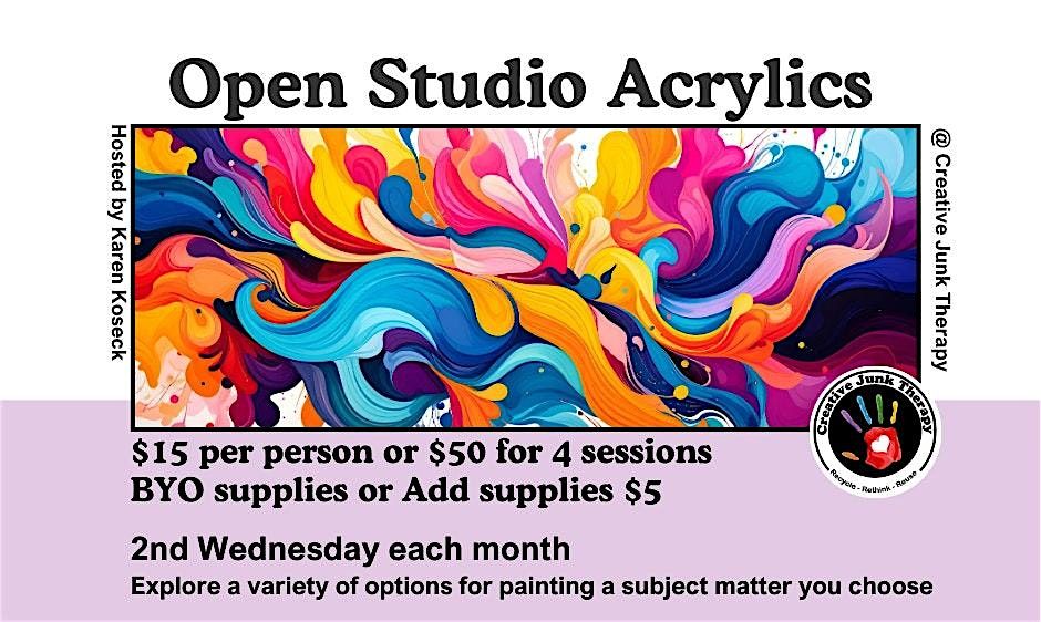 Each class we will explore a variety of options for painting a subject matter you choose. Bring a picture or idea and Karen will guide you through choices so you can learn to evolve your image intuitively and develop your own style. No experience necessary, but prior use of acrylic paint is helpful.