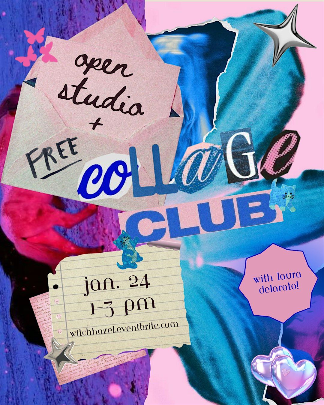 Join us in the Witch Hazel studio for two hours of open studio time and collage crafting, led by artist Laura Delarato. All collage supplies will be provided, but feel free to bring your own projects! All skill levels are welcome.