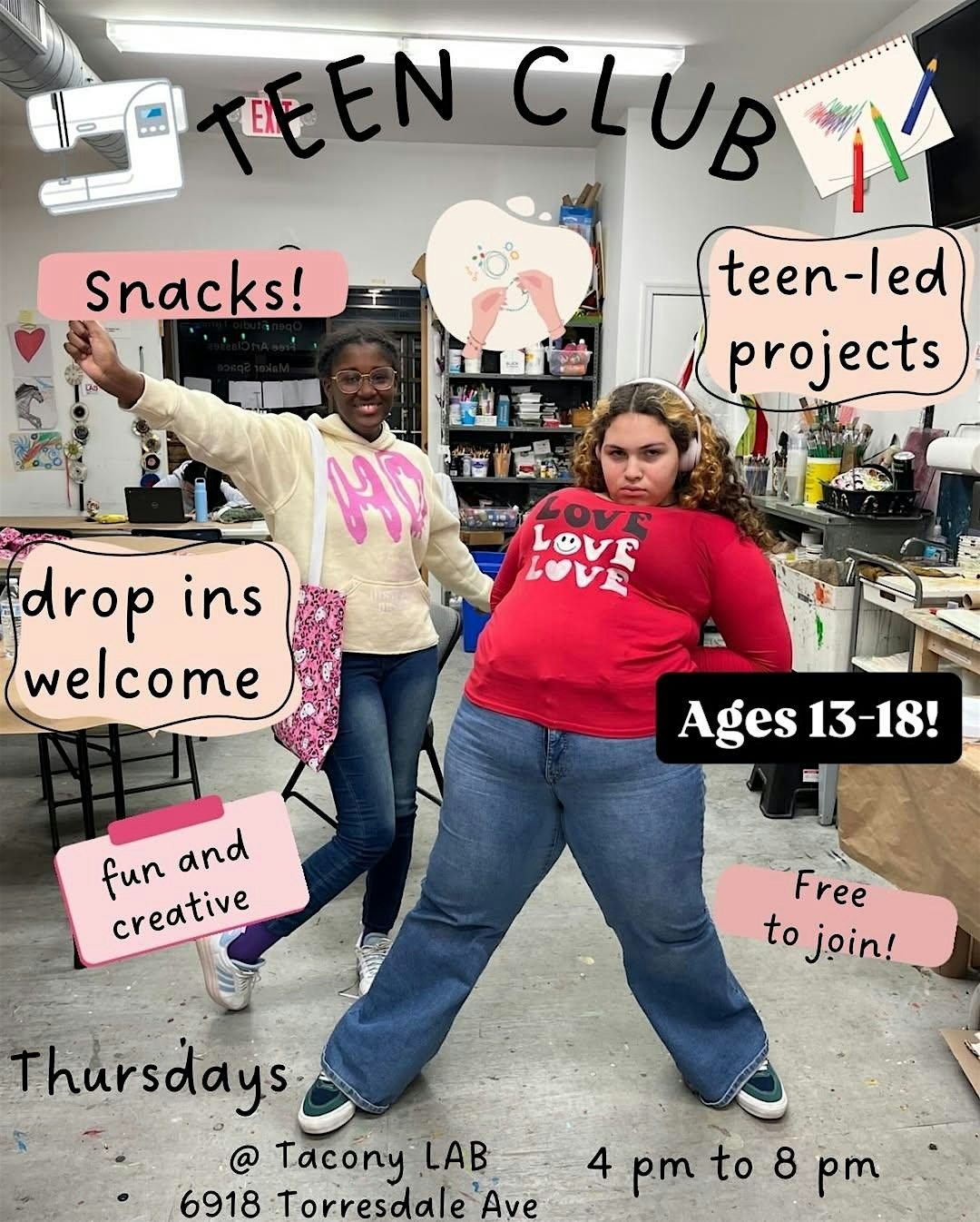 Join us at the Tacony LAB to learn more about our weekly teen open studio. We'll have pizza at this event. Drop in any time between 5 and 8.