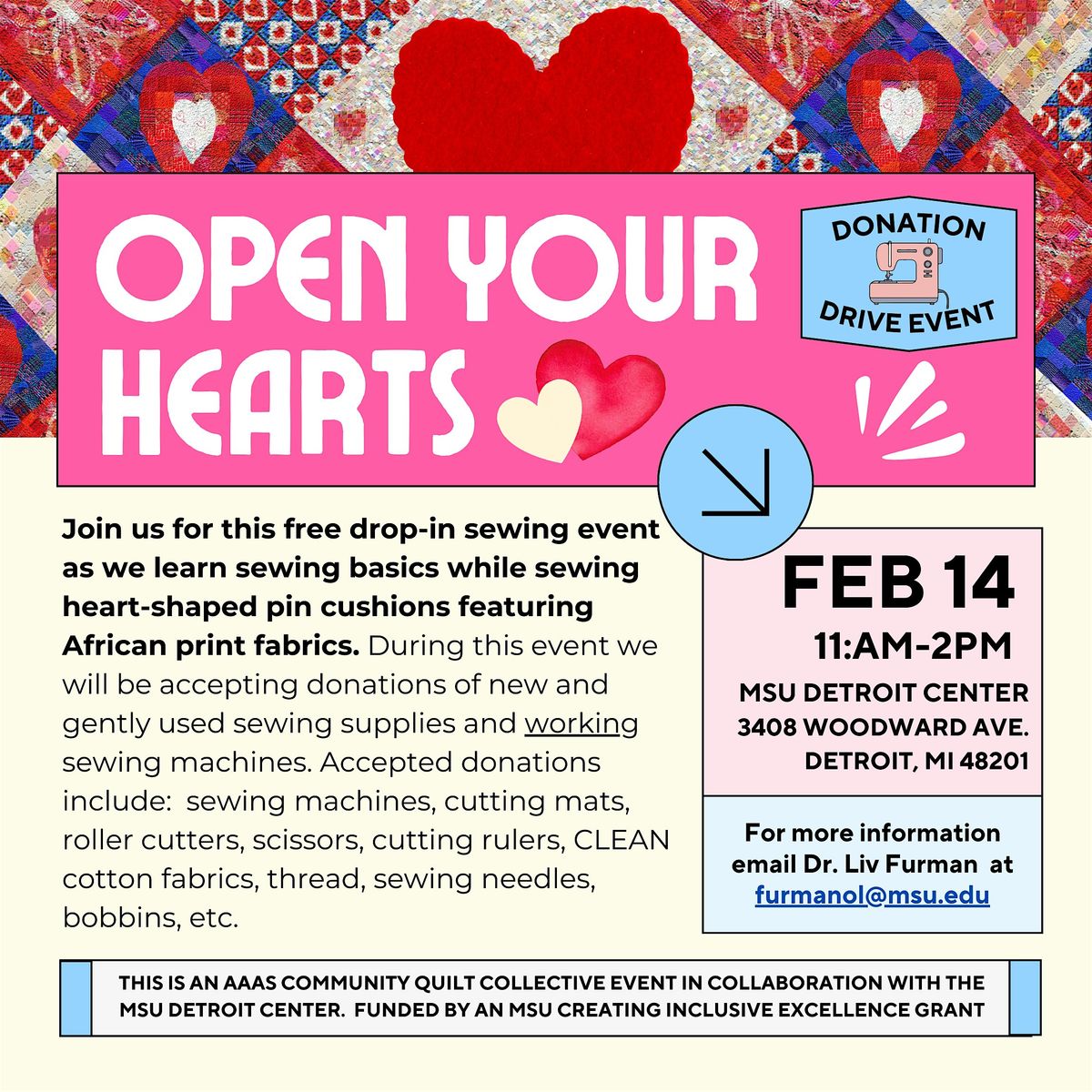 Following this event, the AAAS Community Quilt Collective at MSU Detroit will host a series of quilt workshops for beginners that teach sewing machine and quilt making basics. All workshops will take place on Saturdays from 11am-2pm. At the culmination of the workshop series, the group will host an exhibition and quilt sale. All participants will be invited to display their projects and may sell some of their quilted artwork if desired. Moreover, all participants who attend 5 or more workshops will be able to take home one of the donated sewing machines for their own use at the culmination of the workshop series.