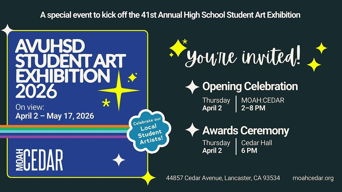 ¡MOAH:CEDAR y el Lancaster Museum of Art and History (MOAH, Museo de Arte e Historia de Lancaster) están emocionados de invitar a la comunidad a celebrar la 41.ª Exposición Anual de Arte Estudiantil del Distrito de Escuelas Secundarias de Antelope Valley (AVUHSD)! Acompáñenos en MOAH:CEDAR del 2 de abril al 17 de mayo de 2026 para experimentar un total de 100 obras únicas creadas por talentosos artistas estudiantiles del Valle del Antílope, incluyendo obras bidimensionales, tridimensionales y multimedia, seleccionadas de nueve escuelas del AVUHSD. Inaugure la exposición el jueves 2 de abril de 2:00 a 8:00 PM, con una ceremonia de premiación que comenzará a las 6:00 PM en Cedar Hall, una maravillosa oportunidad para apoyar a la próxima generación de artistas del Valle del Antílope. Las galerías estarán abiertas hasta las 8:00 PM el día de inauguración. MOAH:CEDAR está abierto de jueves a domingo de 2:00 a 6:00 PM; para más información, llame al (661) 723-6250 o visite www.moahcedar.org.
