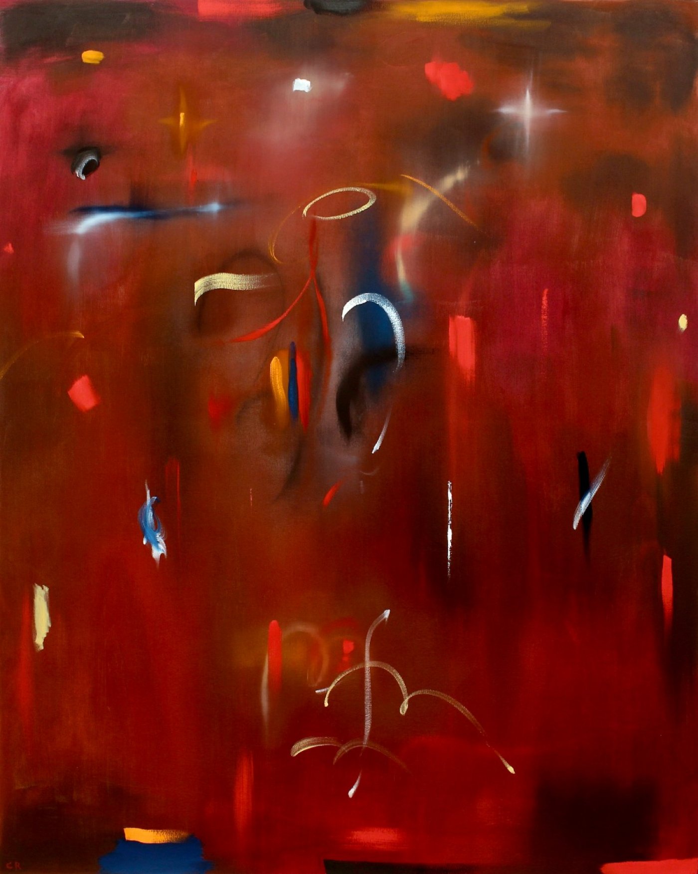 In Ripley’s paintings, glimmers of paint flicker and flare across darkened grounds, activating the surface with a sense of movement and light. Gestural curls and swirls interact with lines and dashes that guide the viewer’s eye in a choreographed passage across the picture plane. These marks are not merely expressive—they are structural, establishing a sense of tempo and poetic cadence that gives each work its internal coherence.