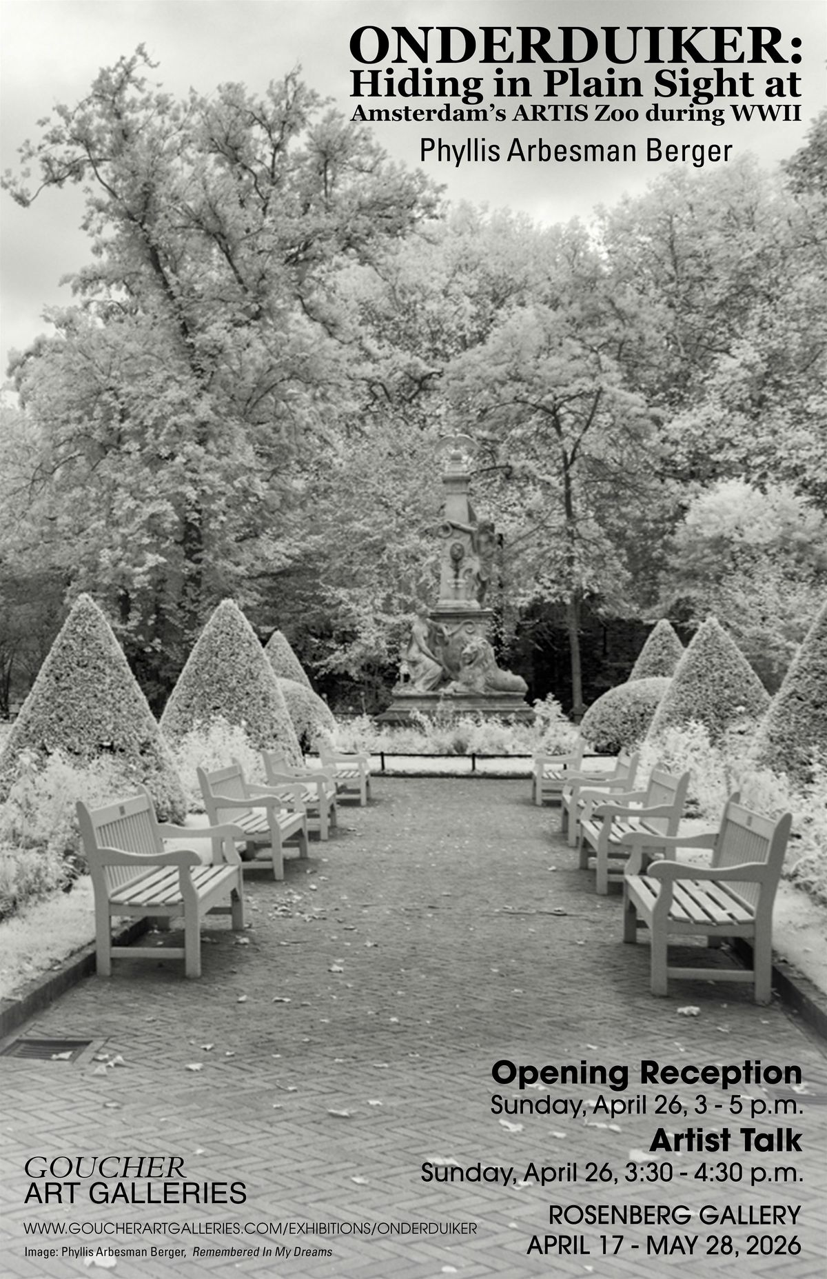Baltimore photographer Phyllis Arbesman Berger’s powerful new exhibition, Onderduiker: Hiding in Plain Sight at Amsterdam’s ARTIS Zoo during WWII. This is the harrowing story of the Jews, resistance fighters, and young men escaping forced labor, who owed their lives to the staff at the ARTIS Amsterdam Royal Zoo during WWII. Using infrared photography and lyrical poetry, Berger explores the psychological landscapes of the individuals who lived in constant fear, not knowing from day to day whether their hiding places might be revealed. Nazi soldiers loved the zoo and visited daily, not realizing that a wall away people were in hiding. Images and text chronicle the struggles of ordinary people caught in extraordinary circumstances as they spend time with their memories, take flight with imagination, and experience longing, grief and at times terror.