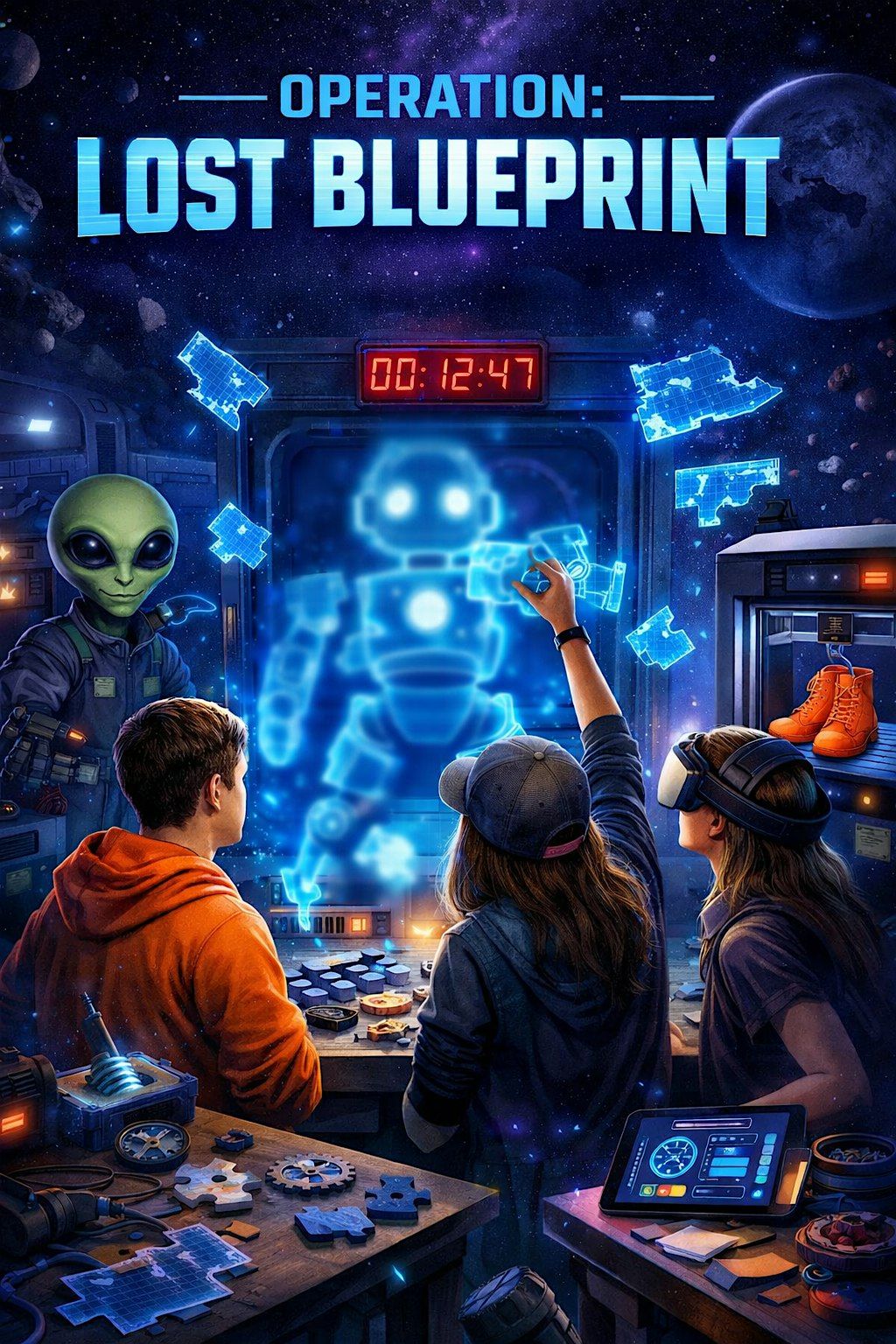 Welcome to TynkerSpace, MakerSpace-Nauts. In this TynkerSpace adventure your mission starts the moment you arrive. An alien traveler has crash-landed, it's power equipment is damaged and now it's stranded. The blueprint needed to fix it? Torn apart and scattered throughout the space. Your team has 60 minutes to track down the missing blueprint fragments, piece the plan back together and assemble the device. Will you make it in time?