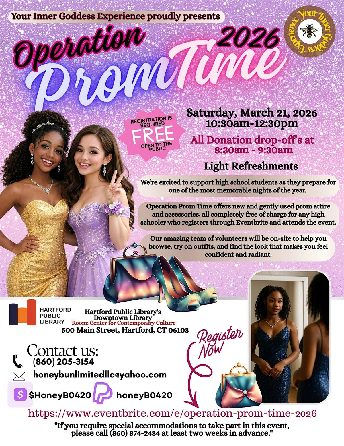 Each young lady will be assigned a "Say Yes to the Dress Assistant". Any questions please contact Hillary Brown 860-205-3154 text/call.