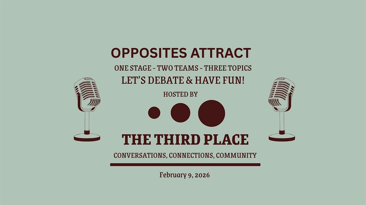 Opposites Attract is a gathering with a debate format where both audience members and experts get a chance to express different viewpoints with a spirit of respect and curiosity. The goal isn’t to win an argument—it’s to explore ideas and discover perspectives and insights you might not have considered. There will be three rounds, moving from light-hearted to deeper topics. Rounds 1 and 2 involve audience participation. Round 3 is the headline debate where prepared experts face off.