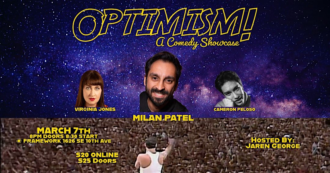 Optimism! (the showcase) IS BACK with a comedy lineup to laugh for! We got Cameron Peloso, Virignia Jones, and our headliner MILAN PATEL! The show with cool surprises and fun times packed in one night. Free popcorn included! Get spoiled with jokes and fun (and free popcorn) March 7th!