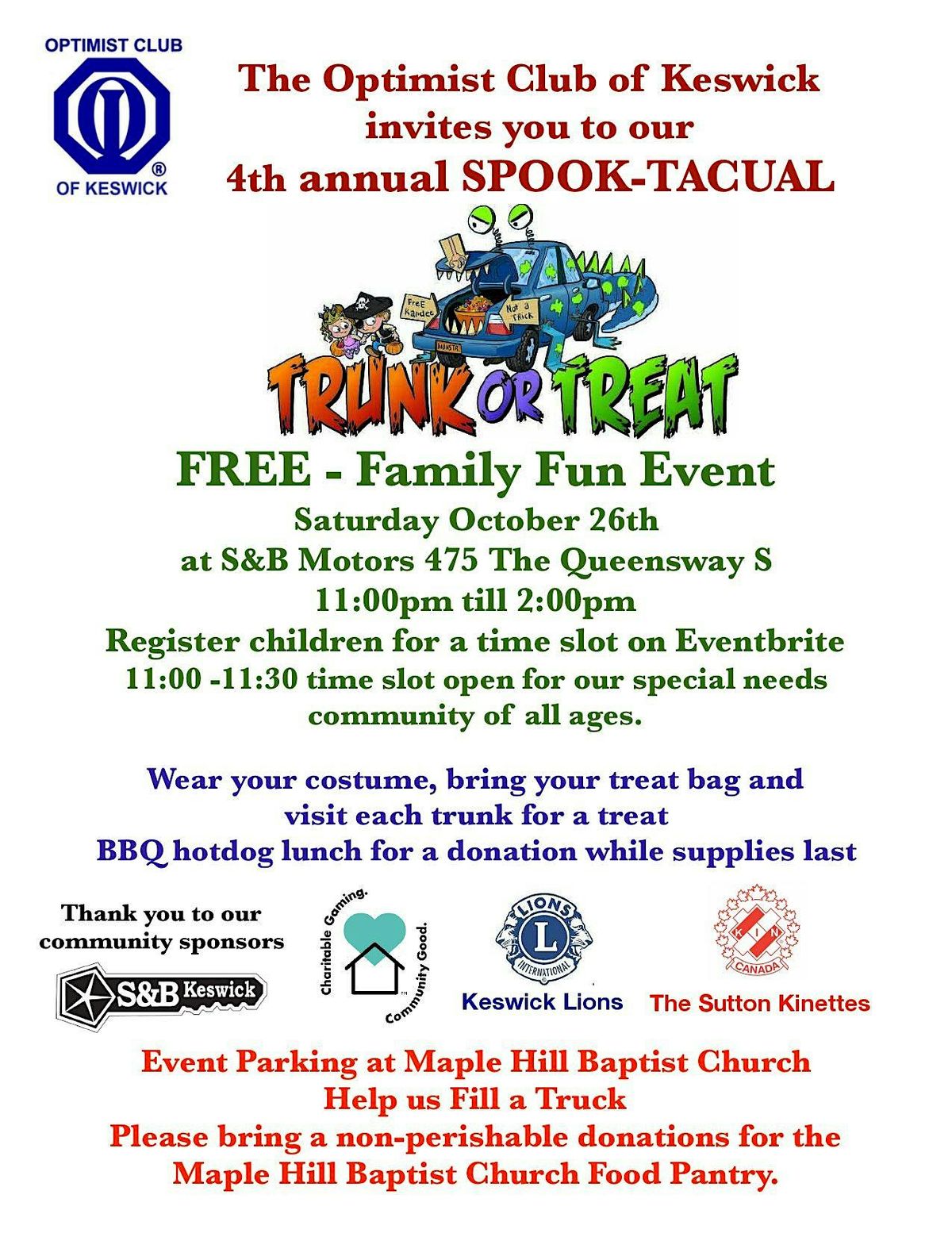 Join us for our 4th Annual Trunk or Treat event on Saturday October 26th 2024 from 11:00 till 2:00 at S&B Motors. Wear your Halloween costume and visit the 20+ local businesses and community groups who will be handing out treats. Please only register children who will be collecting treats. 11:00 to 11:30 will be our quiet time set up for our special needs community of all ages. Parking will be available at Maple Hill Baptist Church located at 215 Glenwoods Ave. Food Donations are being collected in the parking lot and will be given to the Church Food Pantry.