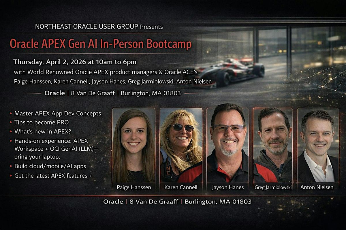 Want to build powerful business apps with less hand-coding? Take the fast lane beyond quick prototypes with the Oracle APEX Gen AI Bootcamp. This free, hands-on event introduces the Oracle APEX approach to modern web app development through a series of in-person sessions, presented by APEX PM and DEV team members and Oracle ACEs. Built for experienced developers new to APEX, it will help you deliver production-ready, data-driven solutions faster, that you can trust! — all while using Generative AI to speed up development and incorporating AI capabilities into your apps.