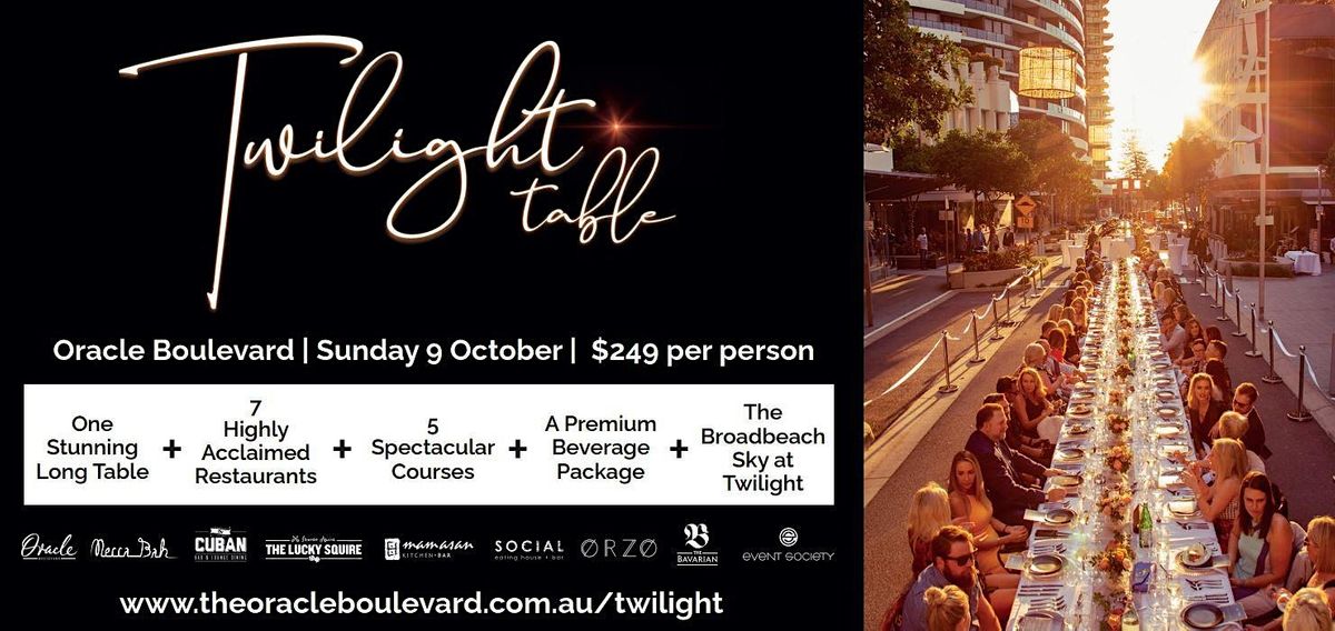 Oracle Boulevard's spectacular Twilight Table is a long table dining event offering a carefully curated 5-course menu. Set along the picturesque backdrop of Oracle Boulevard as the sun sets over the twinkling Broadbeach skyline, the event provides an impressive culinary showcase presented by seven of the Gold Coast's most highly acclaimed restaurants including: