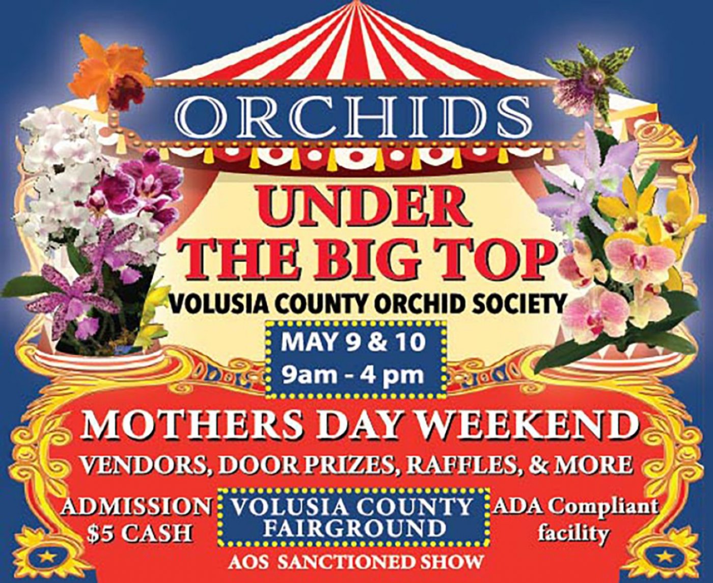 Volusia County Orchid Society’s 31st Orchid Show, “Orchids Under the Big Top”, Mother’s Day Weekend May 9 - 10, 2026, at the Volusia County Fair Grounds 3150 E. New York Ave. DeLand, FL 32724. Hours are 9am to 4pm both days. We have some new vendors and your favorites, too! This is an AOS sanctioned show. Orchids, House Plants, Giftware, Door & Raffle Prizes, Spectacular Displays & Much More! Bring your friends! Our facility is ADA compliant. Admission $5