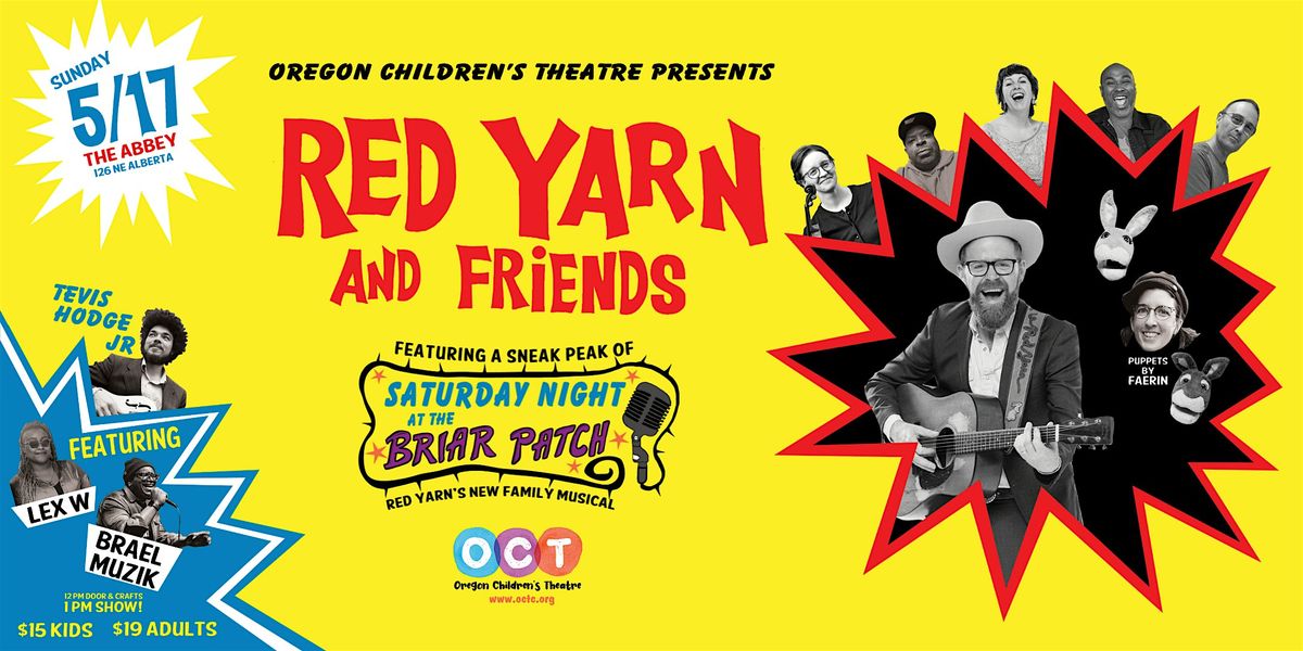 Oregon Children's Theatre is proud to present a special family concert by Portland favorites Red Yarn & Friends! Tevis Hodge Jr will open the show with a short set of family-friendly blues music, followed by a set by the Red Yarn Band. Then, Red Yarn & friends - including Tevis on guitar & guest vocalists Alexis Walker & Brael Armstrong - will present several new songs from their upcoming family musical, "Saturday Night at the Briar Patch." Puppeteer Faerin Millington will lead a puppet-building craft one-hour before the show (12pm) , and the Abbey will offer snacks & drinks at their bar.