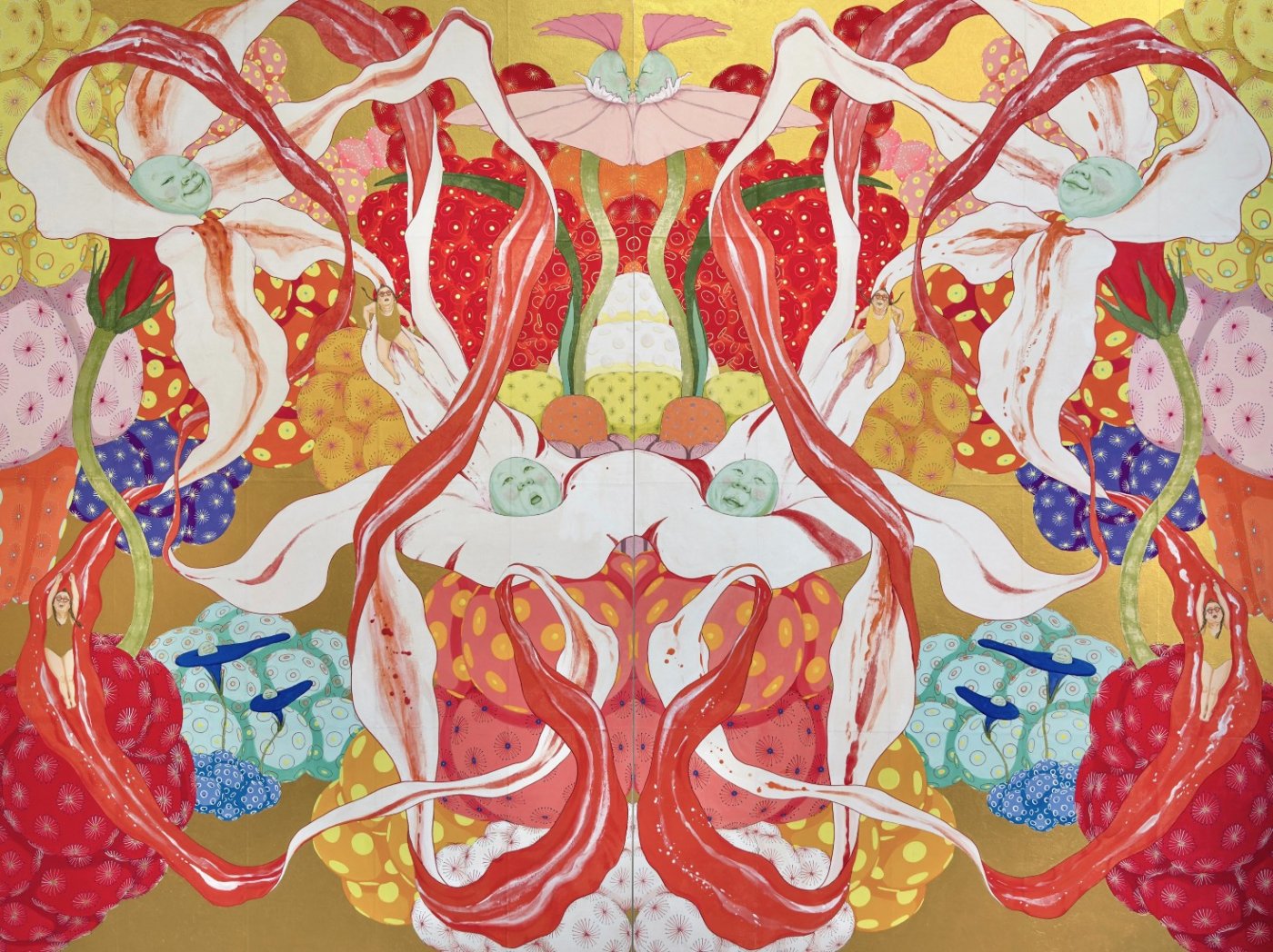 Rooted in traditional Nihonga techniques, Ito’s practice involves layering natural pigments, sumi ink, and nikawa on washi paper, merging the precision of Japanese craftsmanship with the luminosity and dimensionality influenced by the Mediterranean. Her works feature surreal botanica—flowers with human-like faces, swelling organic forms, and cellular patterns—that blur the boundaries between the human, vegetal, and microscopic.