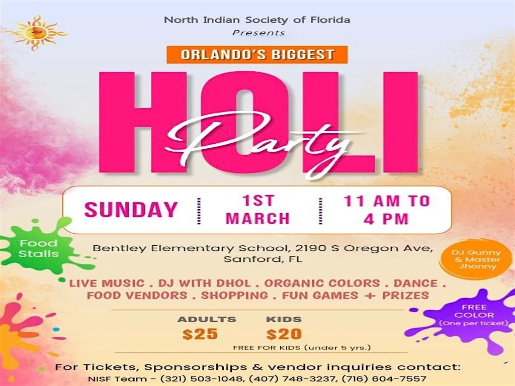Get ready for the most colorful and fun-filled Holi celebration in Orlando! Join us on March 1, 2026 at 11:00 AM (Eastern Time) at 2190 S Oregon Ave, Sanford, FL - 32771. Bring your friends, wear white, and get ready to be covered in vibrant colors, dance to great music, and enjoy an amazing atmosphere. Don’t miss out on this epic in-person party that’s all about joy, colors, and good vibes!