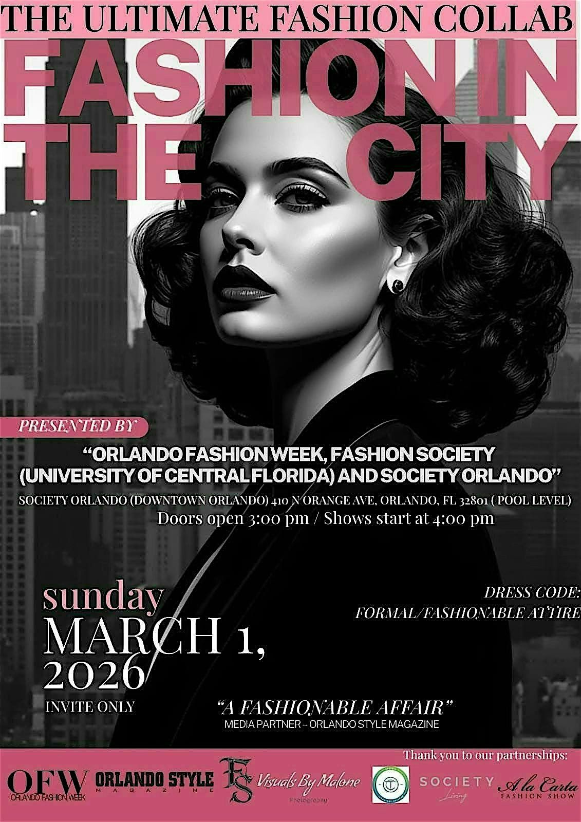 Get ready for an amazing night with Orlando Fashion Week! Join us on March 1, 2026 for the "Fashion In The City" showcase— "Fashion in The City" A Fashionable Affair The "Ultimate Fashion Collab" Fashion Showcase (Fashion Shows) alongside honoring “Orlando’s Elite” business professional trailblazers, including industry networking opportunities, and will be hosted by Jaynas Manohalal, Reporter for News 6 WKMG. Presented by Orlando Fashion Week, Fashion Society University of Central Florida (UCF) and Society Orlando. Media Partner Orlando Style Magazine and Visuals By Malone Photography (Orlando, FL) an in-person event packed with style, creativity. Don’t miss out on the chance to see fashionable designs up close and vibe with the fashion crowd. See you there!