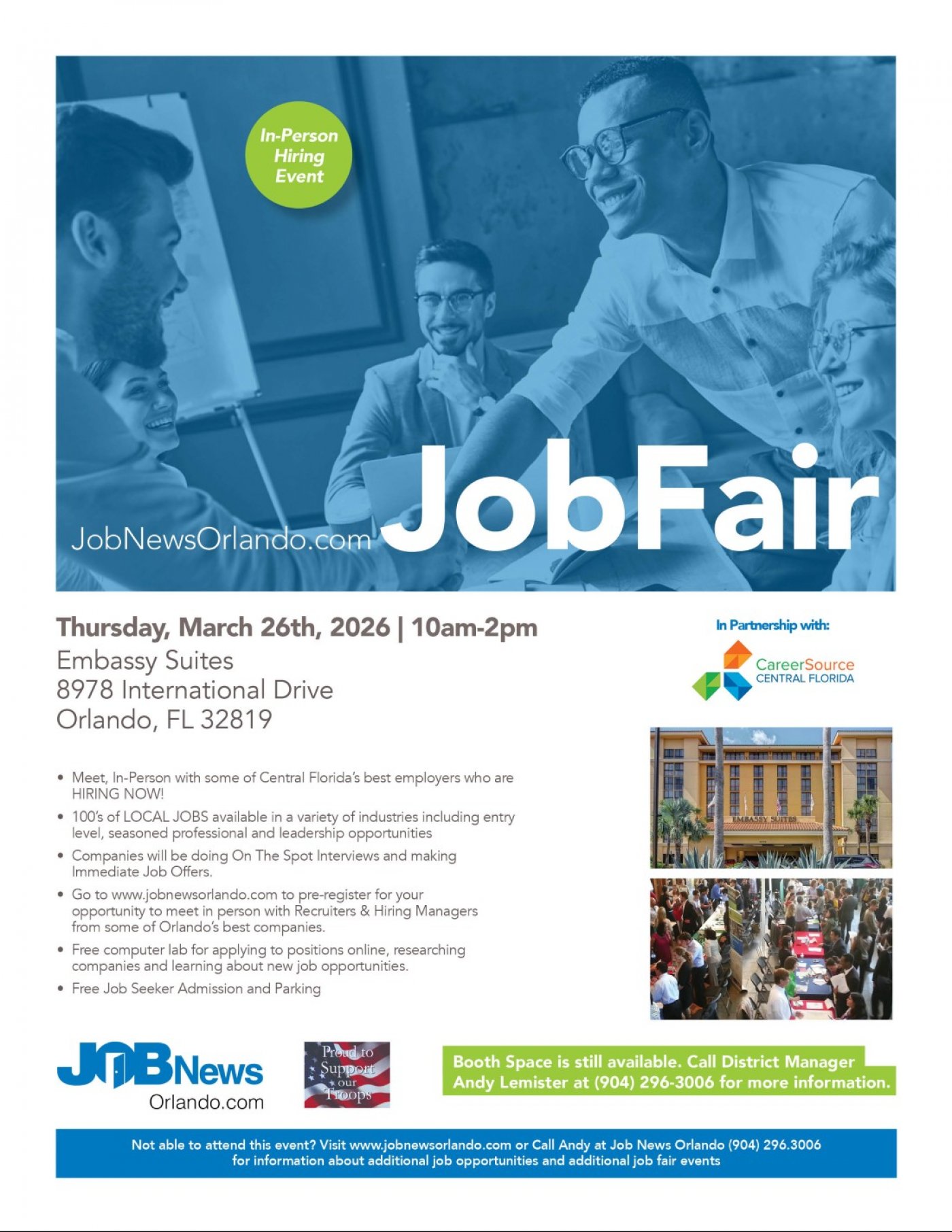 Job News Orlando in Partnership with CareerSource Central Florida will be hosting a Job Fair from 10 am to 2 pm on Thursday March 26th at the Embassy Suites located at 8978 International Drive in Orlando Florida 32819.