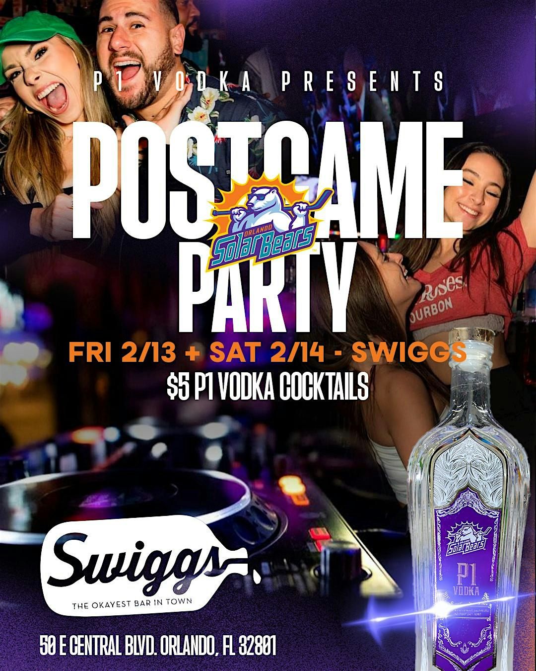 Head straight to Swiggs Orlando for the ultimate Orlando Solar Bears P1 Vodka Postgame Party! This FREE event is your perfect way to keep the energy going after the final horn.