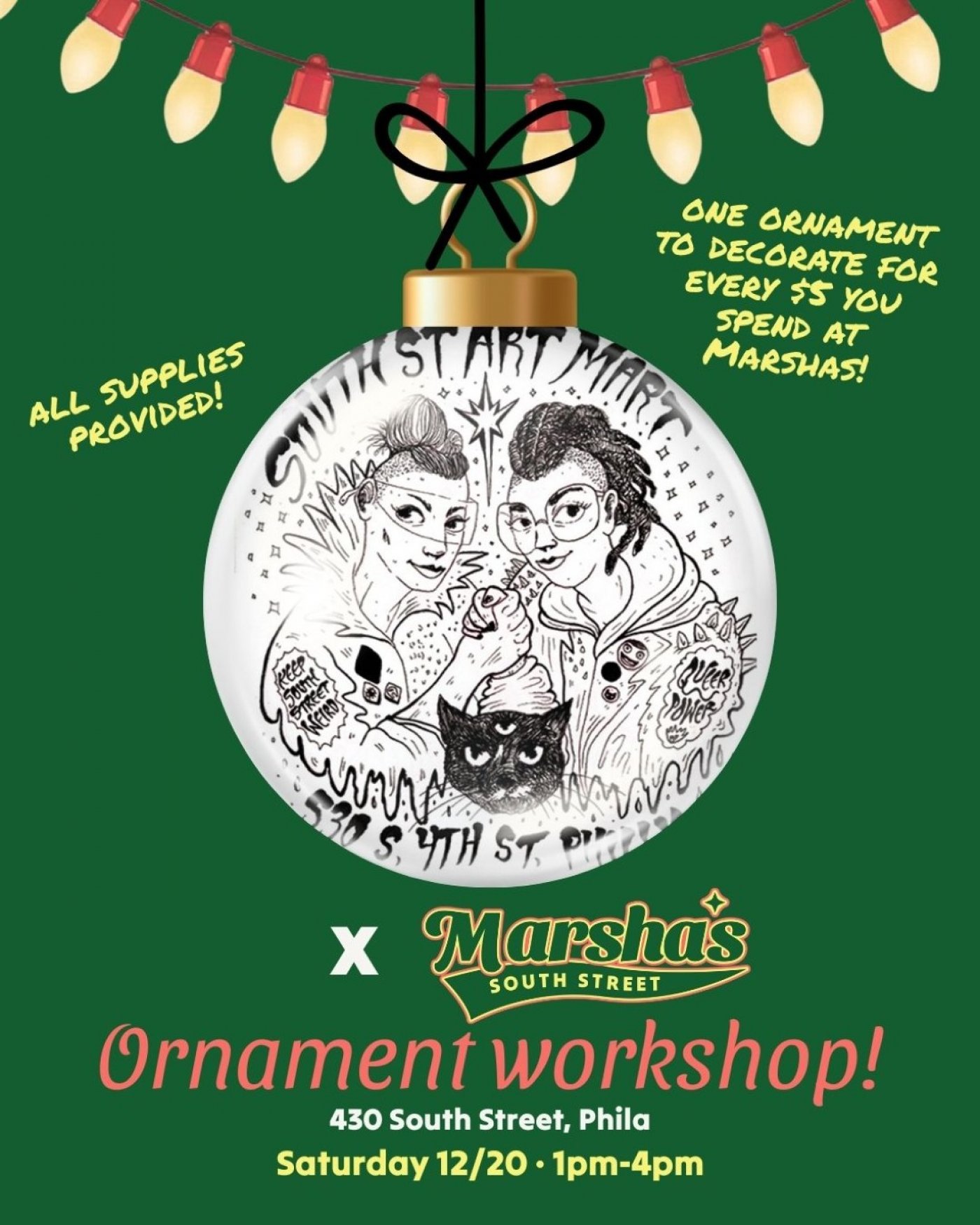 Get festive at Marsha’s South Street with the Ornament Workshop! Guests can decorate one holiday ornament for every $5 spent at Marsha’s, with all supplies provided. Sip, snack, and get creative while crafting your own seasonal keepsake in a fun, festive atmosphere.