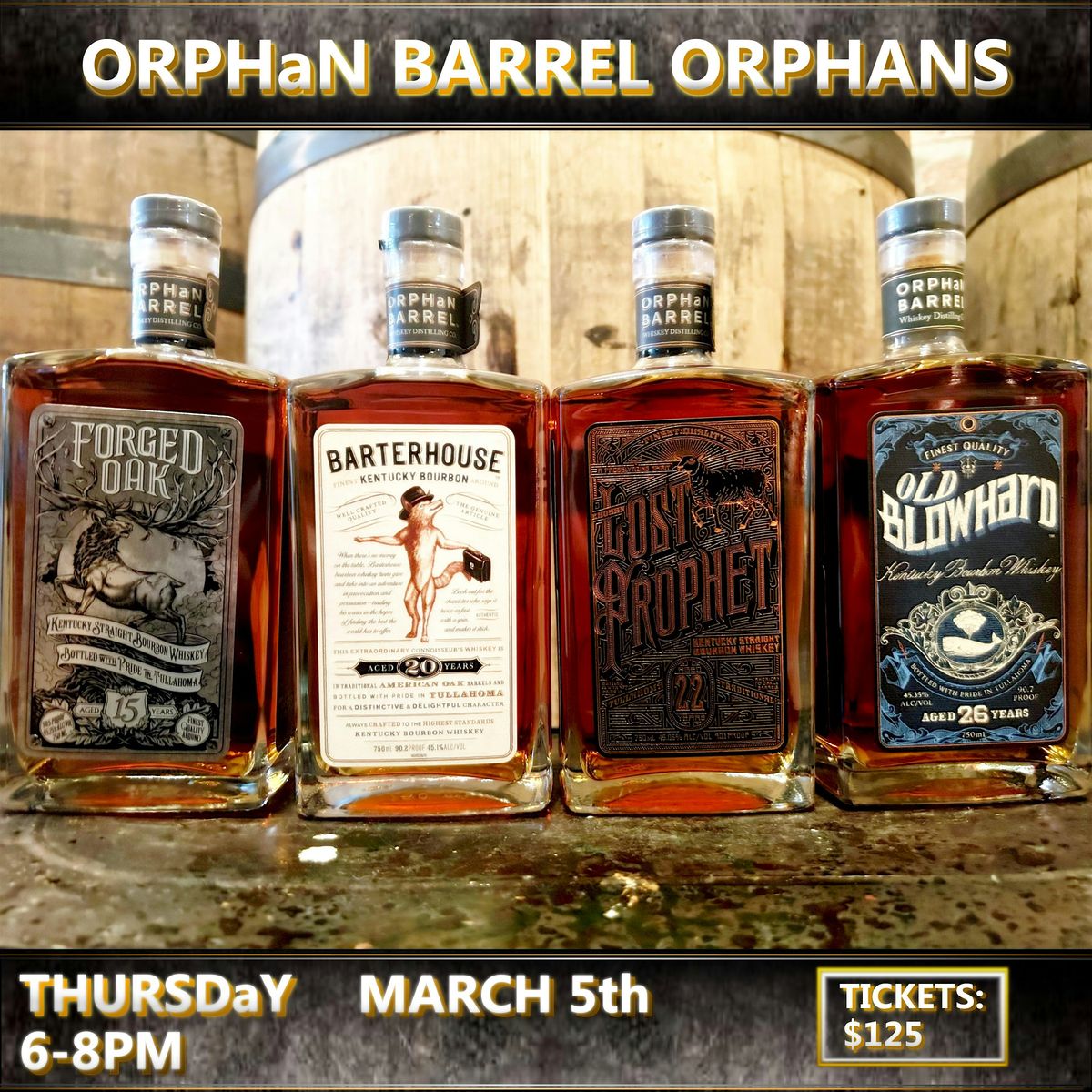 So join us on Thursday, March 5th at 6:00pm for a dive into some particularly fun bourbons from Orphan Barrel, accompanied by light snacks and lively conversation. See below for exactly what we'll be cracking open.