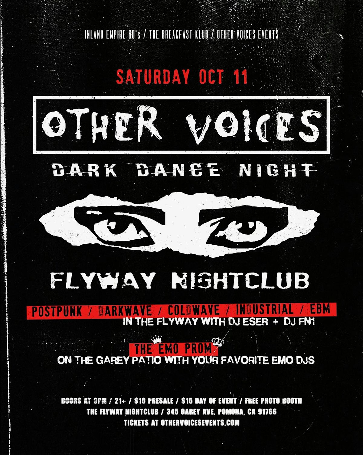Saturday Oct 11th at The Flyway in Pomona!Other Voices Goth Danse night & Emo Prom , 1 ticket gets into both!