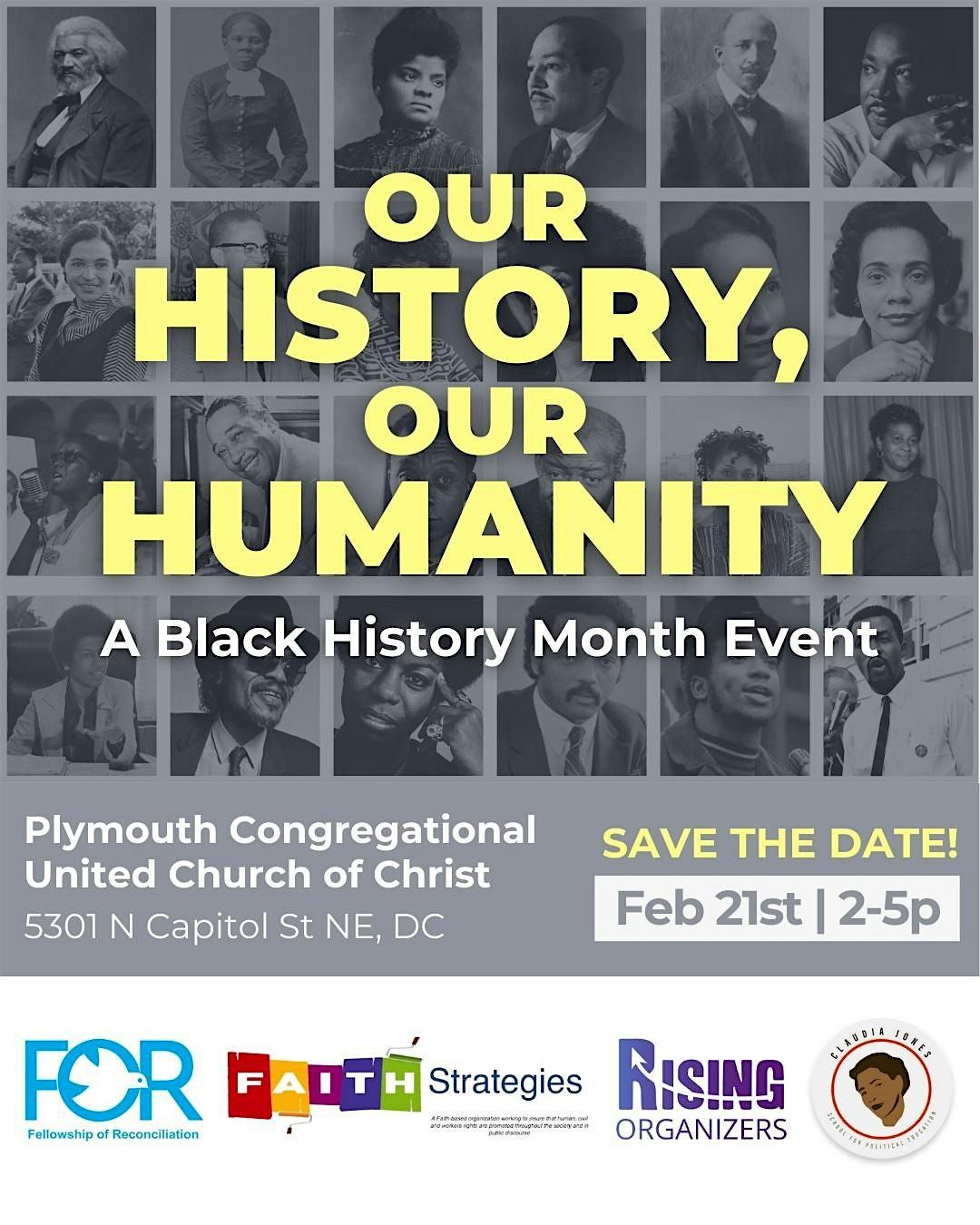 Join the Claudia Jones School for Political Education alongside Faith Strategies, Fellowship of Reconciliation and Rising Organizers for Our History, Our Humanity: A Black History Month Event featuring a panel and cultural performances.