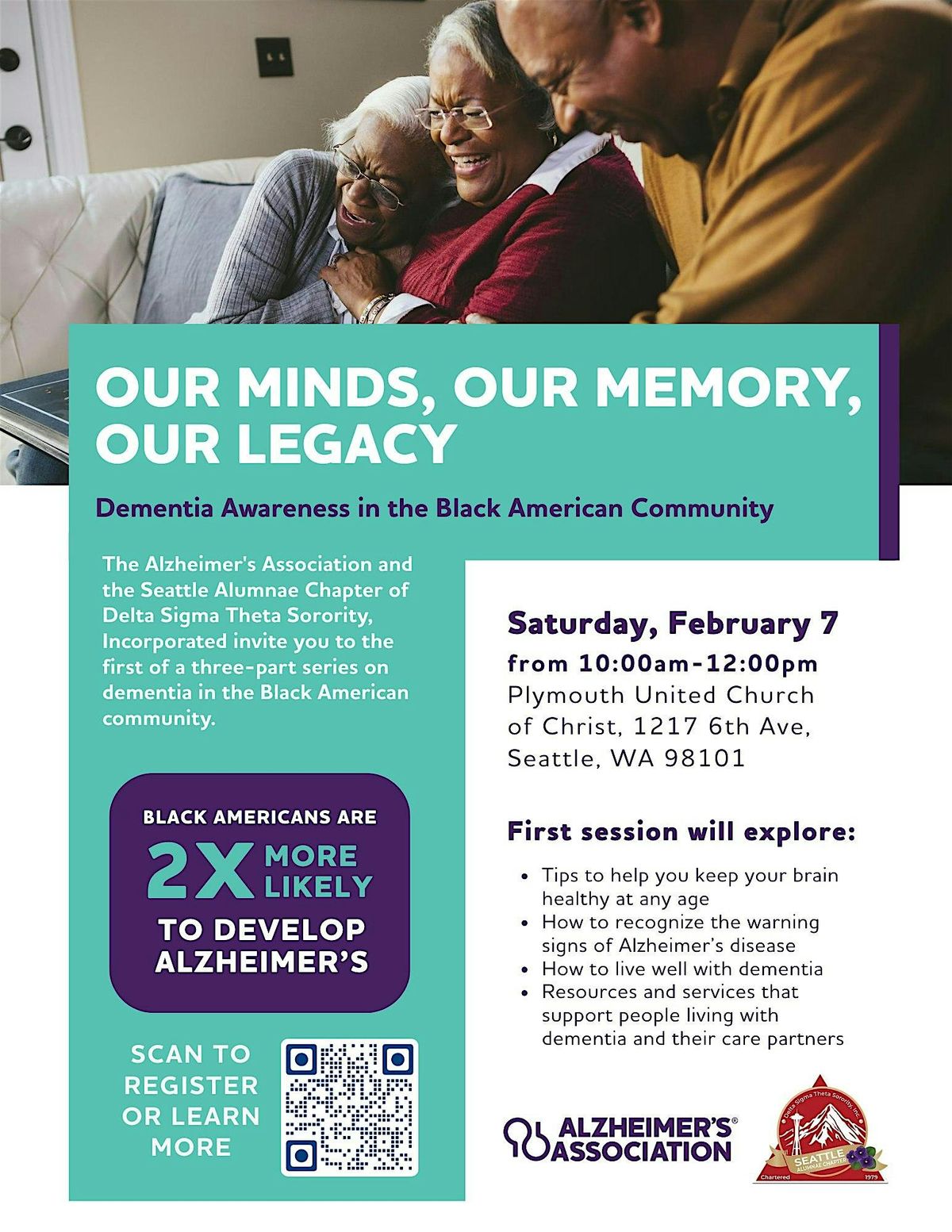 Let's get together for Our Minds, Our Memory, Our Legacy: Dementia in the Black American Community! Join us at Plymouth Church United Church of Christ on Saturday, February 7, 2026 at 10:00 AM (Pacific Time) where we will learn, share experiences, and support each other around this important topic. At this first of a three-part education series, we'll be discussing the following topics: