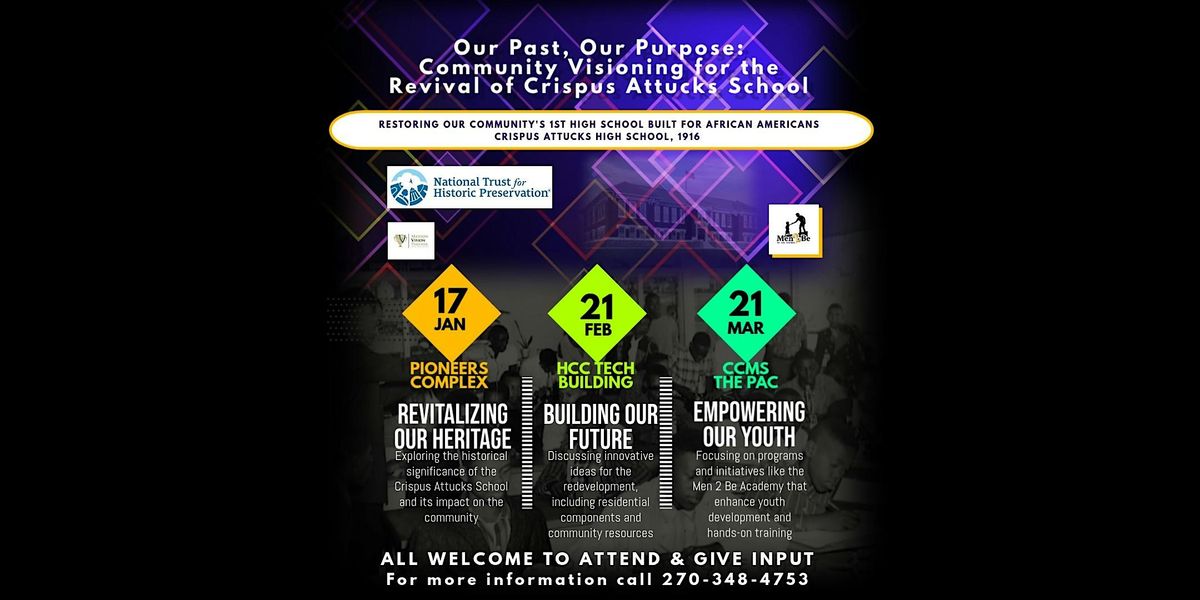 3 community sessions to listen, communicate, & plan the preservation and revival of the historic 1916 Attucks High School by Men2Be, Inc.About this Event