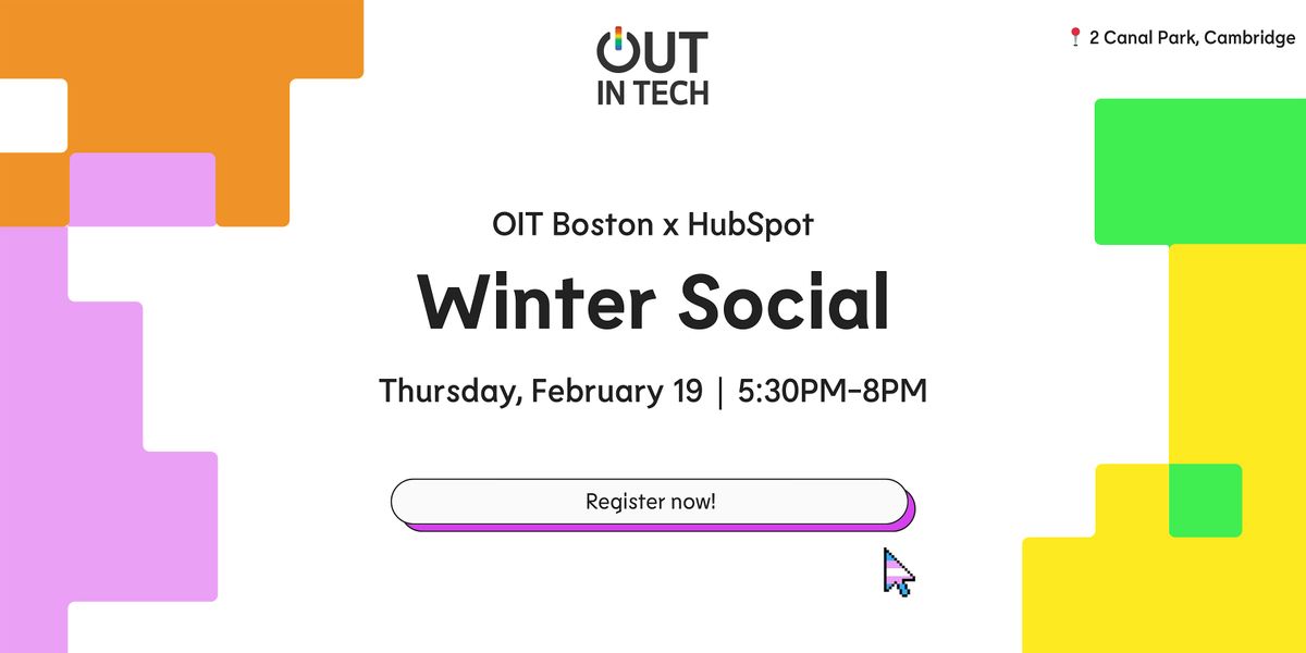 Out in Tech is excited to invite you to join us for our Winter Social filled with wonderful community, food, and drinks at HubSpot's Cambridge office on Thursday, February 19th from 5:30PM-8PM ET at 2 Canal Park.